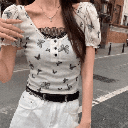 버터플라이 그레이 레이스 투피스 스타일 스퀘어넥 반팔 티셔츠