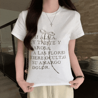 레터링과 리본 디테일이 포인트인 블랙 반팔 티셔츠. 여름에 시원하고 트렌디하게 입기 좋은 크롭 스타일입니다.