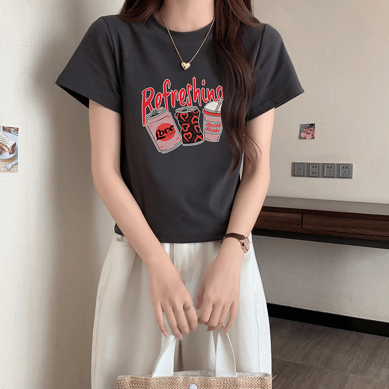 어깨 단축 테 티셔츠 여성 미국 만화 짧은 슬림 한 탑