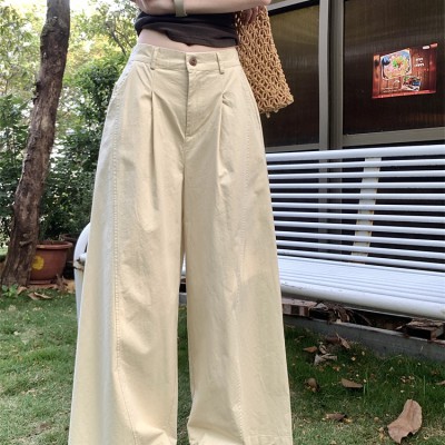 세척 면화 직선 고리 캐주얼 바지 여성을위한 새로운 하이 웨이스트 슬리밍 느슨한 넓은 레그 작은 바지