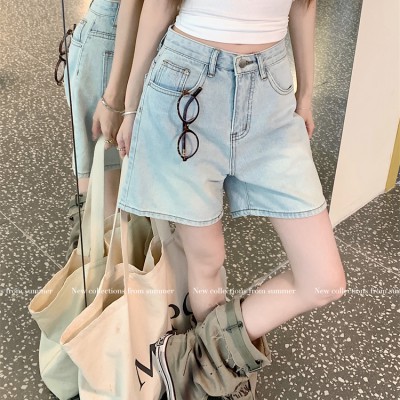 레트로 세척 데님 허리가 높은 여성을위한 5 포인트 바지 느슨한 똑바로 넓은 다리 미드 레그 반바지