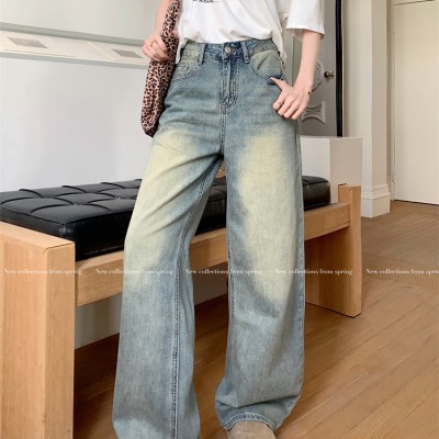 여성의 새로운 하이 웨이스트 슬림 한 A- 라인 스트레이트 레그 바닥 바지를위한 미국 레트로 와이드 레그 청바지