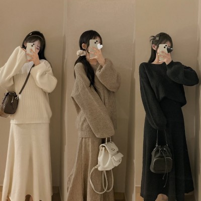 한국 스타일 ins 패션 품격 라운드 넥 풀오버 니트 스웨터 캐주얼 롱 스커트 투피스 세트