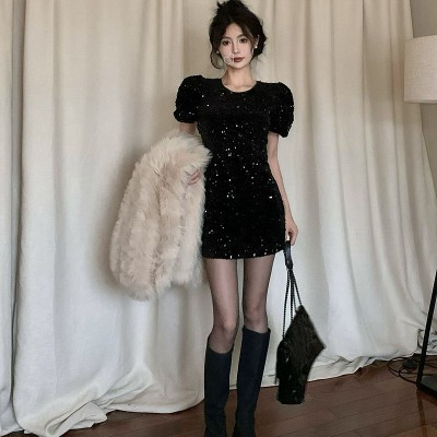 허리 껴안는 슬림 한 짧은 치마 고급 스커트를 가진 여성을위한 실제 가격 겨울 레트로 스팽글 벨벳 등받이 드레스